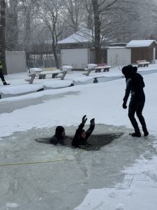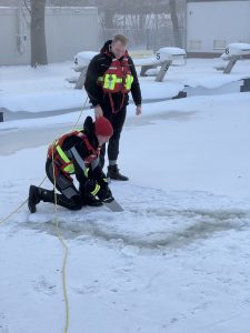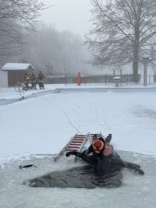 Im weiteren Verlauf konzentrierten sich die Übungseinheiten auf die Rettung einer ins Eis eingebrochenen Person. Die Kräfte erprobten verschiedene taktische Vorgehensweisen – vom sicheren Annähern über den eigentlichen Rettungsvorgang bis hin zu Maßnahmen des Eigenschutzes der Retterinnen und Retter. Die extremen Witterungsbedingungen verlangten allen Beteiligten höchste Konzentration, körperliche Belastbarkeit und Teamarbeit ab.